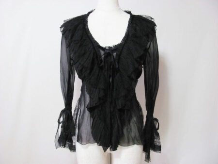 出張買取ご利用のお客様よりアルベルタフェレッティのブラウスを買取しました。細部のカッティングや縫製にこだわり抜いたブランド、アルベルタフェレッティ。繊細な女性を表現するにはぴったりのアイテムがずらりと揃います。シースルーのブラウスをお譲りいただきました。黒でシックな雰囲気もありつつ、リボンやフリル使いが女性の柔らかさを表現してくれます。