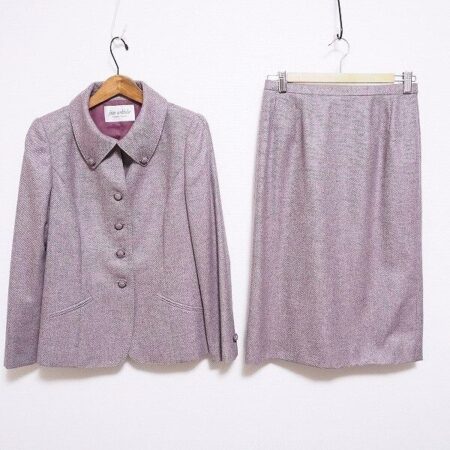 着るだけで格式高い印象を与えられるジュンアシダのお洋服。スカートスーツを出張買取いたしました。サイズは9号です。襟もしっかりした気高い雰囲気のスーツ。紫という高貴な色にも注目です。