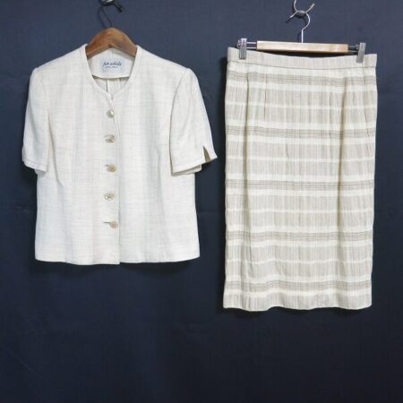自立した女性に人気のジュンアシダ。この度はスカートスーツを買取しました。スカートはボーダーではありますが、はっきりしすぎることなく綺麗に決めていただけます。ジャケットの襟もノーカラーで優しい雰囲気ですね。