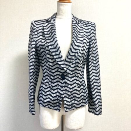 シルバーと黒のバランスがよいジャケット。ジョルジオアルマーニのアイテムを出張買取にて買取しました。ボーダーとはまた違った柄で個性を出しつつ綺麗な雰囲気を演出してくれます。サイズは38でメリハリある雰囲気も素敵です。