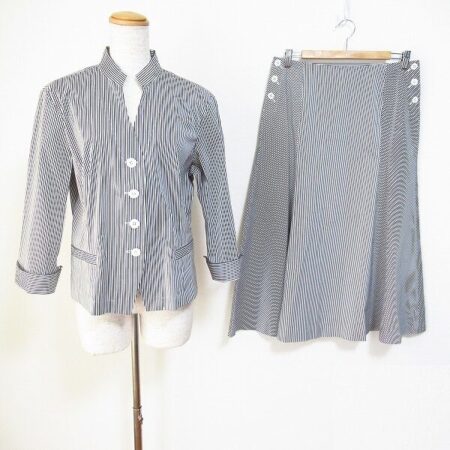 ヨシエイナバのセットアップ。出張買取ご利用のお客様より買取しました。黒白のストライプですが、どこか軽やかでスタイリッシュに着られます。スカートもフリルが効いていて気持ちも高まりそうです。