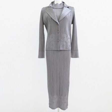 プリーツプリーズのアンサンブルを買取しました。しっかり刻み込まれたプリーツ。グレーの柔らかさとマッチしてスレンダーな印象にしてくれます。適度なかわいさも兼ね備えたありがたいアンサンブルです。