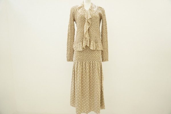 今回ご紹介させていただくのは、イッセイミヤケのセットアップになります。胸元のフリルがゴージャスで、スカートのふんわりとフレアタイプなので、優しい印象が感じられる仕上がりになっています。