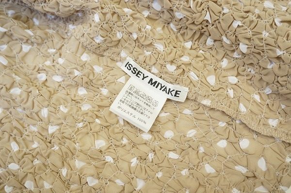 また、生地が編み込んだような不思議なデザインなので、まるで水玉かのように見えるガーリーなテイストも見受けられます。しかし、色合いがベージュ系で落ち着いているので、大人の雰囲気はそのまま保たれています。さすがは、イッセイミヤケといったクオリティの高さと言えるでしょう。