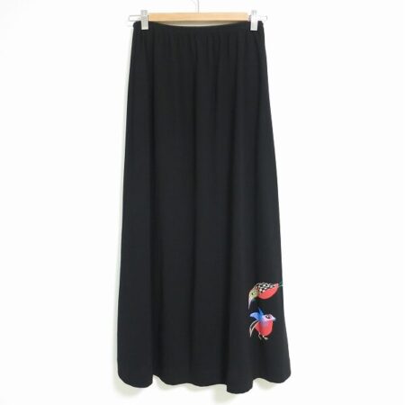 出張買取でトクコのスカートを買取しました。綺麗なライン、黒の統一感が素敵です。隅の方に存在している鳥柄モチーフ。色のポップさと黒の相性が抜群でセンスの良さが光ります。