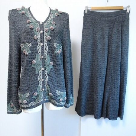 ソワレドヒロミのセットアップを買取しました。ニットではありますがスリムなフォルムが素敵なアイテム。花モチーフも濃いグレーにマッチしていて上品綺麗に映ります。