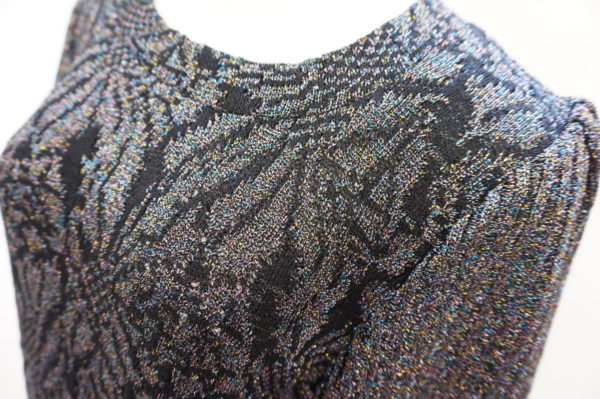 今回お買取させていただいた作品もまさに斉藤都世子ワールド全開のニットワンピース。身頃には上品にきらめくラメの糸で描かれた大きな花の模様が。お袖はタックをとってボリュームを持たせたリブ編みで。
