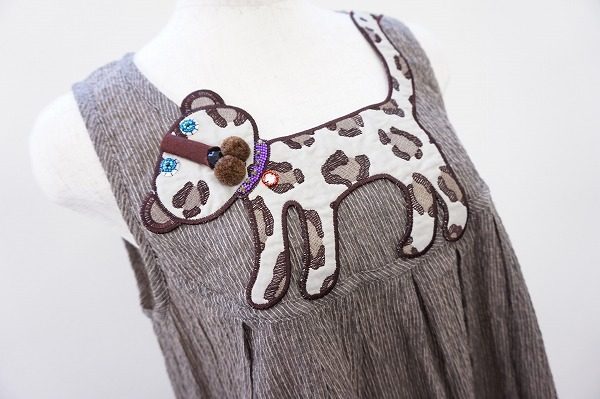 こちらのワンピースもそのひとつです。このワンピース、とてもキュートなザラザラとしたブラウンカラーやドレープするように設計されたデザイン、裾の微妙なフリフリ感など、かわいい要素がたくさんなのですが、すべて胸元のネコのアップリケが目線を奪います。
