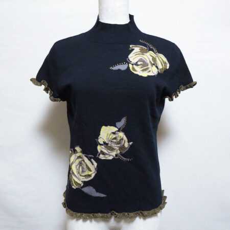 宅配買取ご利用のお客様よりエムズグレイシーのセーターを買取しました。安定感のある濃紺に明るすぎない黄色のバラが程よく映えた1枚。袖もフリルになっていて見つめるたびにハートを撃ち抜かれてしまいそうです。