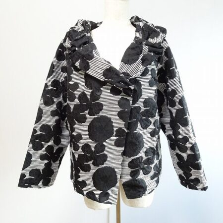出張買取にてバラ色の暮しのジャケットを買取しました。タグ付きで綺麗なお洋服です。白と黒ですが花柄のインパクトに助けられて可愛らしさが上がります。ゴージャスなテイストにも仕上げていただける素晴らしいアイテムです。
