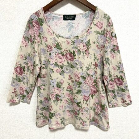 バラ色の暮しのカットソーを出張買取ご利用のお客様より買取しました。サイズはLです。ベージュの優しい雰囲気に和やかなバラが調和した素敵なトップス。裾部分も上品なペプラムで気持も高まります。