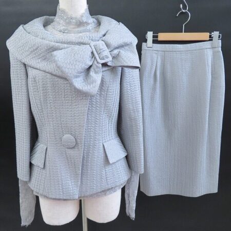出張買取にてベラのスカートスーツを買取しました。サイズは38です。胸元のリボンがアクセントとなるジャケット。スカートはシンプルでいい具合のバランスです。遊び心も加わった素敵な1枚。
