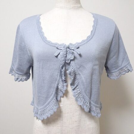 出張買取でピンクハウスのカーディガンを買取しました。女性人気の高いアイスブルーが美しさだけでなく清楚な雰囲気も出してくれます。リボンの具合もちょうどいいです。