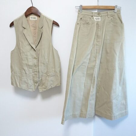 ベージュでまとまり感のあるセットアップ。出張買取ご利用のお客様より買取しました。甘めのテイストが多いピンクハウスですが、スタイリッシュな雰囲気で楽しませてくれます。柄アイテムの上からでもぜひどうぞ。