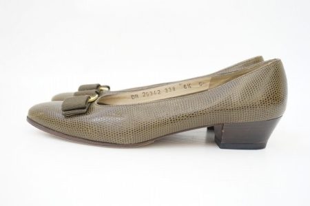 ヒールが低く、つま先が丸く愛らしいデザインで、歩きやすさと見た目のデザインの両方にこだわりをもって作られた、フェラガモを代表する逸品です。