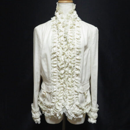 かっこいい印象が強い伊太利屋ですが、画像のように可愛らしいアイテムもあります。ジャケットを出張買取しました。フリルが贅沢に使用されている嬉しい1着。清潔感もある嬉しいジャケットです。