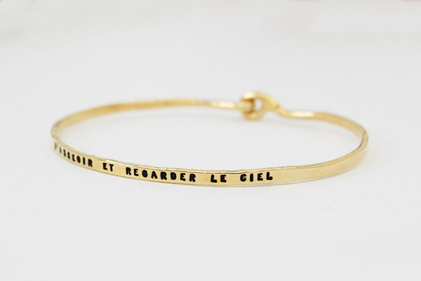 シックでシンプルなブレスレットですが、刻印されたフランス語のメッセージがユニークで個性的です。どんなファッションにも合わせやすく肌に馴染みやすいゴールドカラーは、ボーダーにジーンズといったよくあるカジュアルなフレンチルックにコケットリーを感じさせてくれる絶妙なアクセントになってくれるでしょう。