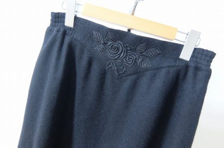 バラ色の暮し(バライロノクラシ)は庭に咲く色とりどりのお花から発想を得た花柄プリントが印象的なブランドですが、こちらはガラッとシックなブラックのスカート。でも、やはりバラクラには欠かせない、薔薇の刺繍がウエスト部分に施されています。スカートの丈はミモレ丈でフェミニンな装いです。日常のファッションに英国ガーデンの花を彩ってくれる「バラ色の暮し」は、アクイールのお客様のなかでも評判が良く、只今、買取強化中です。