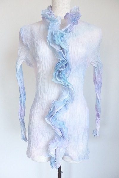 こどもっぽくなりがちだったり、フェミニンな印象に偏りがちなフリルトップスですが、個性的で美しいブルーのカラーリングにより、マニッシュにもモードにも着こなせる他にない一着に仕上がっています。パンツスタイルにもぴったり。シンプルなコーディネートのアクセントにもなる、アクセサリーのようなカットソーはこのブランドならではです。