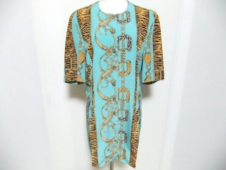 水色とヒョウ柄の組み合わせもですが、大小合わせたベルトの柄が描かれている、大変インパクトの大きいデザインのお洋服です。