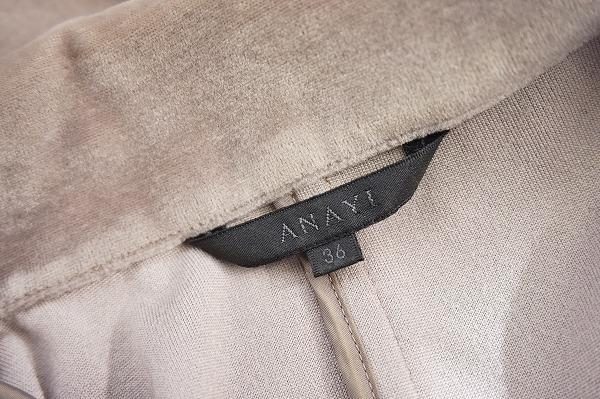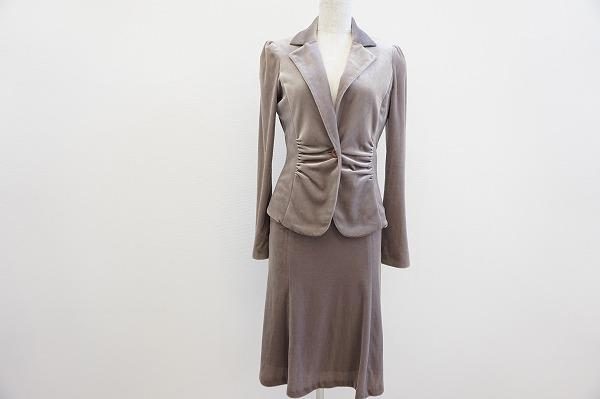 今回、こちらでご紹介させていただくのは、アナイのスカートスーツになります。素材がベロア生地というこもあって、大人っぽい雰囲気と高級感も感じられます。また、お色味が薄いベージュなので、どの年代の方にもお召しいただけるかと思います。