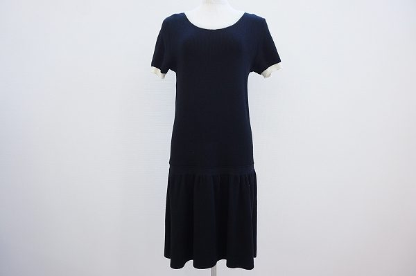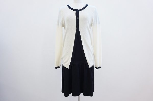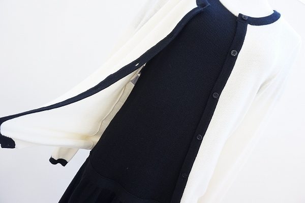 こちらのアンサンブルが、モスキーノのものです。黒のワンピースに、白のカーディガンというスタンダードなスタイル。素材にはヴァージウールを使い、”シンプルかつ上質”というファッションの原点を象徴するようなアイテムとなっています。