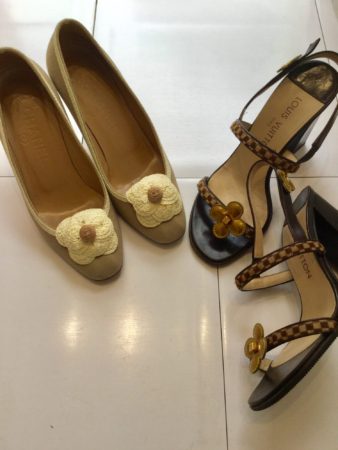 足元にも花を!……ということで、シャネルのアイコン、カメリアがついたパンプス。クロシェで出来た花弁がなんとも愛らしいです。かの有名なルイ・ヴィトンのモノグラムにある4枚の花弁。このモチーフは日本の桜?家紋?とも言われています。ダミエ柄との組み合わせがアールデコっぽくて素敵!