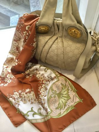 グッチのフローラルプリントのスカーフは明るいブラウンを基調に白とベージュ、パステルグリーンで優しい印象。秋の色と思われがちなブラウンですが、この色味なら春らしいですね!
