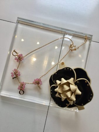 ディオールのネックレスは桜の花弁を思わせる可憐なデザイン。まさに今つけたいアクセサリーですね。アククサンドル・ドゥ・パリのバレッタはモノトーンのカメリア。アールデコを思わせる、すっきりとしたフォルムが大人な雰囲気です。