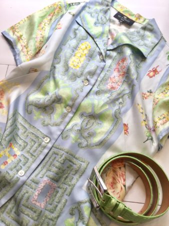 フランス式庭園のユニークなプリントブラウスはエトロ。花や植物ではなく、整然としたフランス式庭園を描いたものは珍しいです。淡い色彩だけで描かれたプリントは、白のボトムで爽やかにどうぞ。
