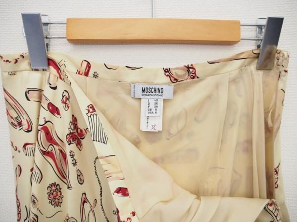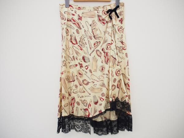 今回ご紹介させていただくのは、モスキーノのシルク素材のスカートになります。ポップなプリントのデザインが全面に施されており、縦ラインのシルエットがスタイルも良く見せてくれます。裾にはブラックのレースが付いているので、エレガントでもあり、アクセントにもなっています。