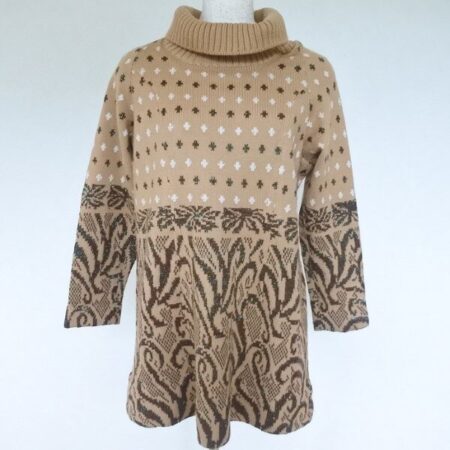 出張買取にて斉藤都世子のチュニックを買取しました。ベージュの優しい雰囲気にエレガントな柄がよくマッチしたニットです。首元はタートルですので、しっかりした雰囲気を出しつつ温かくいられます。