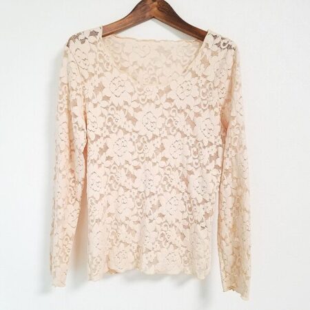 出張買取においてバラ色の暮しのカットソーを買取しました。サイズはMです。ホッとするベージュのキレなレース。メッシュになっているためどこか柔らかく軽く着ていただけます。肌を露出するのはまだ早いという時にも使っていただけますね。