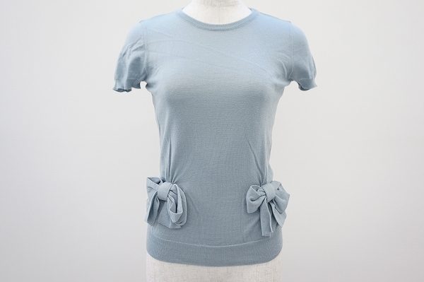 クルーネックの半袖ニットというオーソドックスなアイテムですが、ポイントは一目瞭然「リボン」です。
