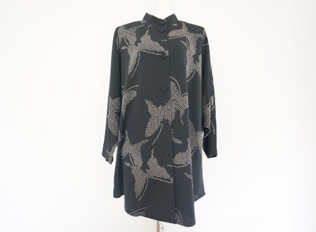 ブランドの特徴とされる手織りちりめん素材を使用し、軽い着心地で肌に馴染み抜群ジャケットはでモノトーンでハンサムライクな表情を持ちつつ和柄の蝶柄が美しく華やかさも感じられるデザインです。ロング丈でゆったりしたシルエットでインナーに厚手の物を着たりも可能で体のラインを拾い過ぎず羽織りやすい優秀アイテム。
