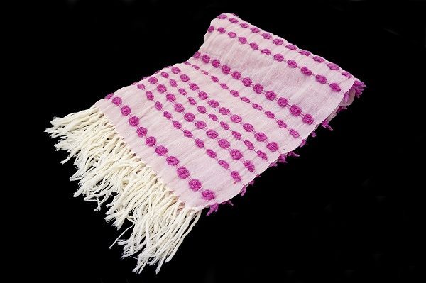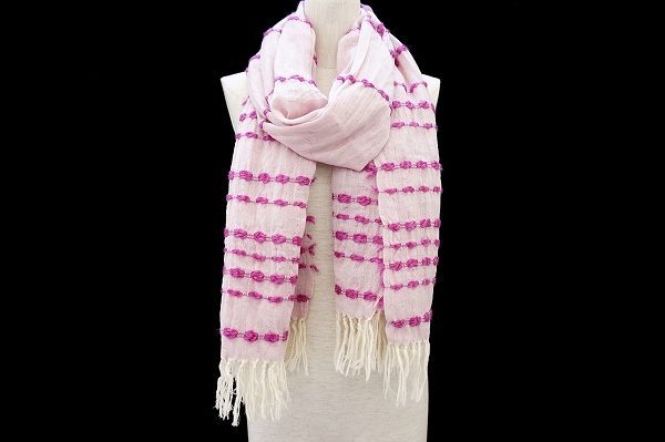 今回買い取りをいたしましたストールは、淡いピンクと濃いピンクのストライプのデザインで、女性らしいストールです。生地の素材も柔らかで涼しげなので、夏らしいリゾートコーデにぴったり。