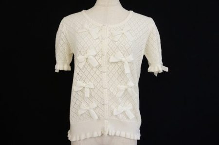 涼し気な透かし編みのニュアンスに、リボンやフリルがふんだんにあしらわれたデザインは、ピンクハウスの十八番。