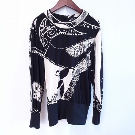 50代のお客様よりレオナールのカットソーを買取しました。黒と白のシンプルな色使いながらもこだわり柄でパーフェクトな存在感。こなれた上級オシャレの出来上がりです。ジーンズを合わせてラフさを出してもいいですね。