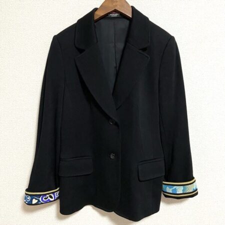 レオナールのジャケットを買取しました。出張買取ご利用の方の美品です。黒でまとまっているかと思いきや、袖口にレオナール特有の柄がさりげなくあって心ときめきます。上品にそしておしゃれに着ていただけますね。