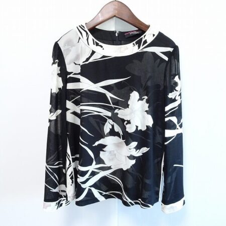 レオナールのカットソーを買取しました。サイズはLLです。黒と白でピシっとまとめられたお洋服。レオナールならではの豪華なお花プリントが高級感を演出です。シースルーなのも程よい上品さを出してくれます。