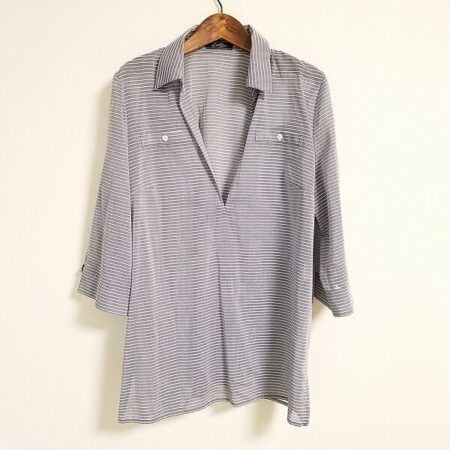レリアンのシャツを買取しました。出張買取です。グレ―と白のストライプシャツ。線の1つ1つが細いので圧迫感がなく楽しんで着ていただけるかと思います。首元もスマートに開いていて、スッキリ楽しめるのも歓喜ポイントです。