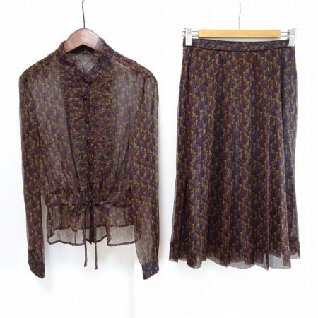 出張買取にてレリアンのセットアップを買取しました。サイズは9号です。シースルーで軽めですが茶色でまとめられておりシルクの上級さも感じられますのでワンランク上のファッションが楽しめます。