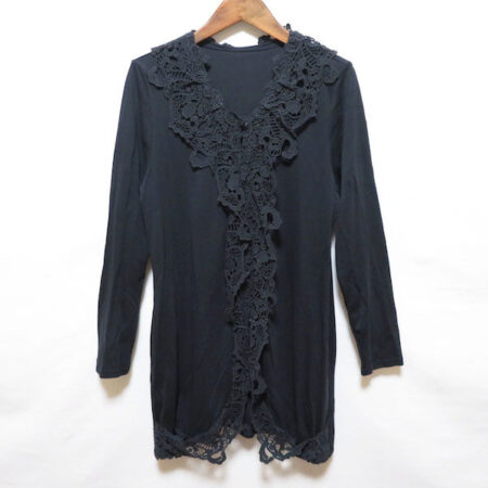出張買取でシズカコムロのカーディガンを買取しました。サイズは40です。大人女性が喜ぶレース、ロング丈で色っぽさをアピール。柄物お洋服の上からも羽織っていただけます。