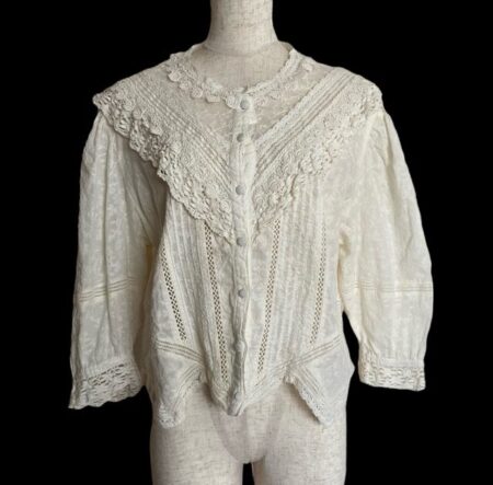 出張買取でバラ色の暮し シャツを買取しました。レースが可愛らしいシャツ。しかし七分袖なので可愛くなり過ぎず適度な愛らしさに惹かれてしまいます。胸元がゴージャスなのもいいですね。