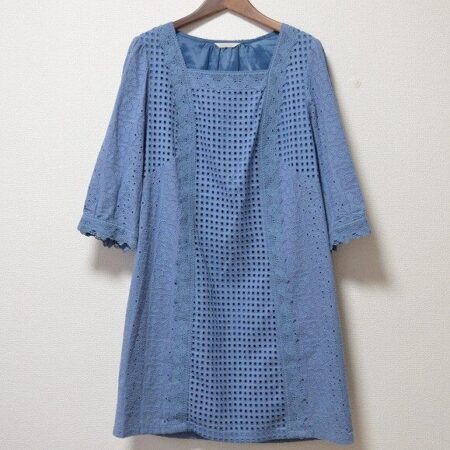 ローズティアラのワンピースを出張買取ご利用のお客様より買取しました。サイズは42です。濃すぎず薄すぎない丁度いい青。上品さを感じられます。五分袖丈でしっかりとまとまった雰囲気に仕上げてくれるのがいいですね。
