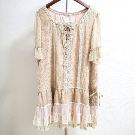 出張買取にてローズティアラのチュニックを買取しました。全体的に優しい雰囲気をキープしていて、フリルやドットの可愛らしさもいい具合に引き立つ1枚です。タイトなパンツを合わせてスッキリ着てしまいましょう。