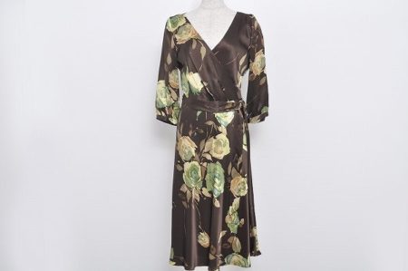 茶ベースに白や緑とナチュラルカラーでまとめた、大人女性を上品に引き立てる花柄のワンピースです。
