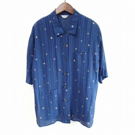 三年坂 十彩のシャツを出張買取ご利用のお客様より買取しました。濃いめの紺にストライプがきいた1着。フリーサイズなのでのんびりリラックスして着ていただけるかと思います。