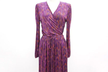 こちらのワンピースも紫をベースとしながらも多色使いで印象的な色彩を放っています。