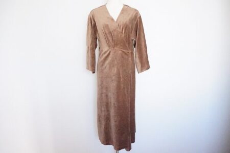 今回お買取りしたコートは女性らしい優しく光沢のある色合いで、ふわっとガウンのように羽織、体を包みこんでお洒落な大人の女性な雰囲気にしてくれます。Vネックのデザインなので重ね着する時もスッキリ見えてネックレスなどが映えるので是非お試し下さい。